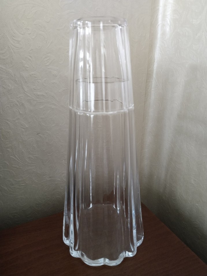 Uzun, şeffaf bej camdan yapılmış, dalgalı tasarıma sahip başucu sürah . geri iadesi yoktur..