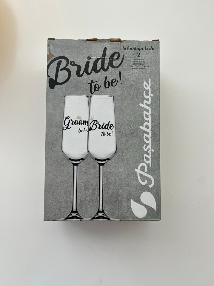 İki beyaz kadehten oluşan set, biri "Bride to be!" diğeri "Groom to be!" yazılı, kutusunda şık tasarım.
