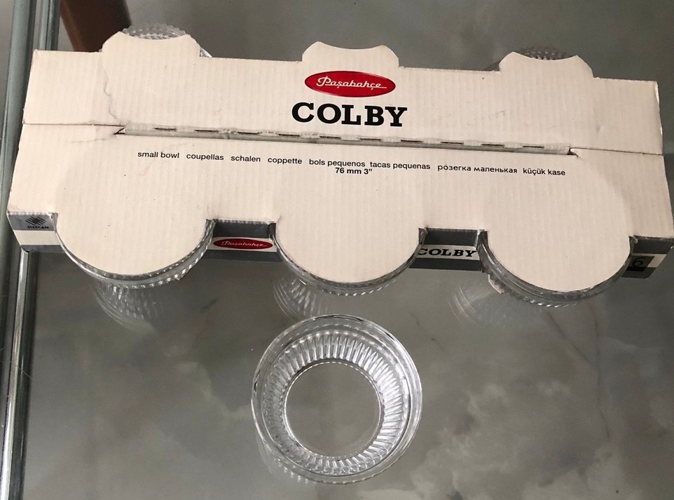 Sıfır üründür..Reçel,Çerezlik, Sosluk,vs vs için kullanılabilir..Pasabahçe Colby serisi, 76 mm çapında 6 adet şeffaf cam kaseden oluşur. Her kase, küçük porsiyonlar için uygun kabartmalı desene sahiptir. Pratik ve temizlemesi kolaydır. ️