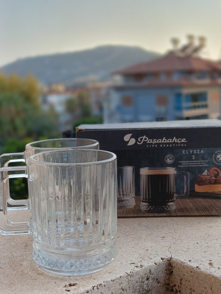 Pasabahce Elysia set, iki adet kabartmalı desenli, sağlam saplı şeffaf bej renkli klasik kupa içerir.