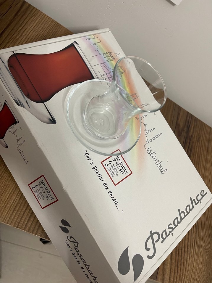 Paşabahçe ince belli çay bardağı seti, şeffaf camdan klasik tasarıma sahip, yanında uyumlu tabaklar ile birlikte sunulur.