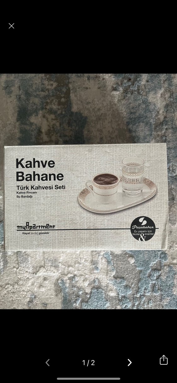 Bej kahve fincanı, su bardağı ve tepsiden oluşan Türk kahvesi servisi seti. ☕ kutusuyla duruyor hiç kullanılmadı