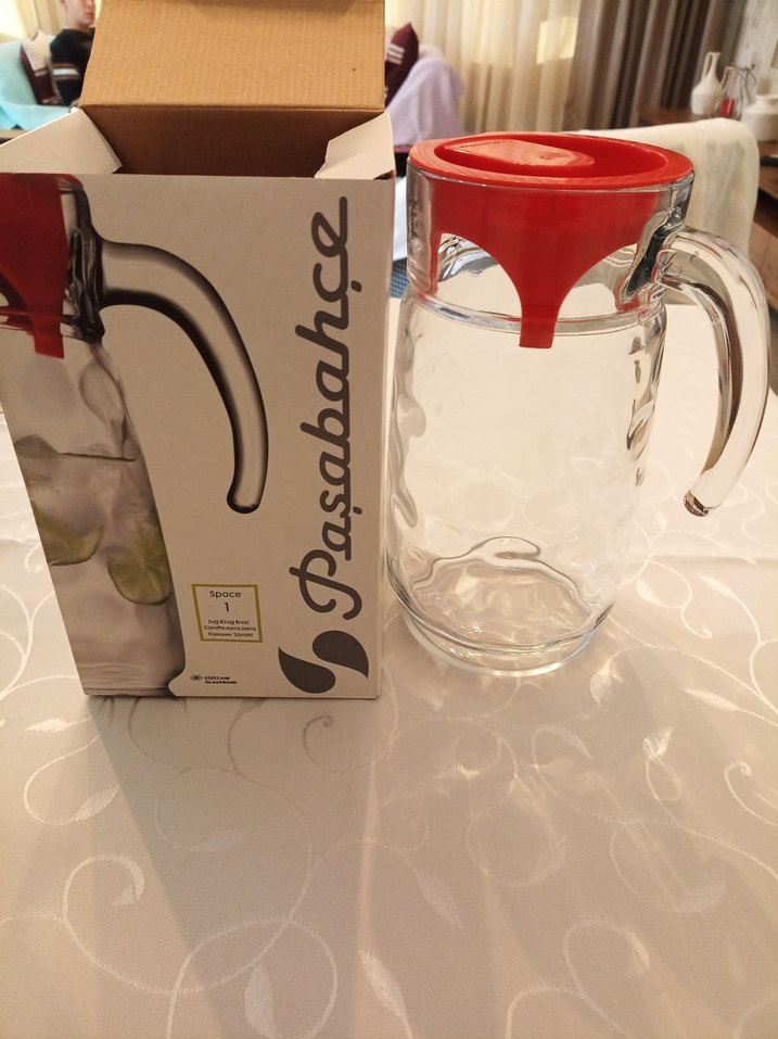 Sıfır ürün.Paşabahçe cam sürahi, kırmızı kapak ve saplı tasarıma sahiptir. Orijinal kutusunda.