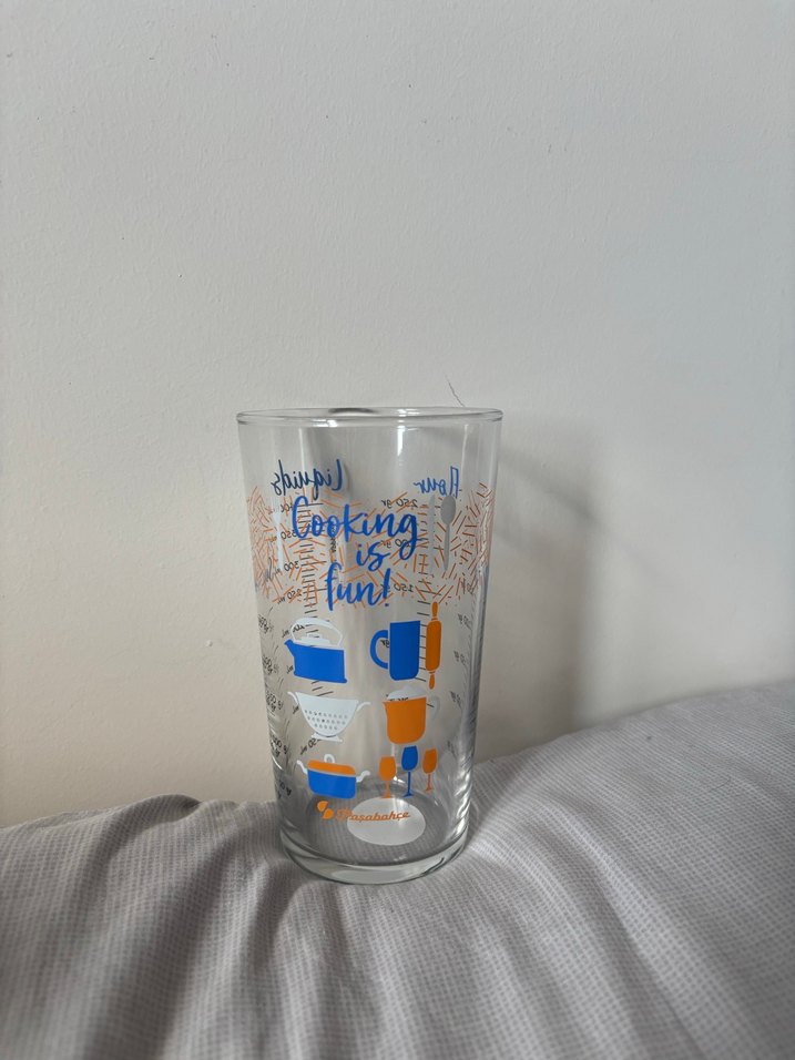 Turuncu desenli, "Cooking is fun!" yazılı cam bardak, mutfak temalı grafiklerle süslenmiştir.