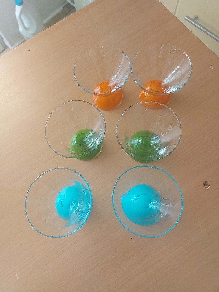 Alt kısımları turuncu, yeşil ve mavi renkli, üst kısmı şeffaf olan altı adet cam dondurma kase seti. Canlı renkli ayaklarıyla şık bir görünüm sunar.