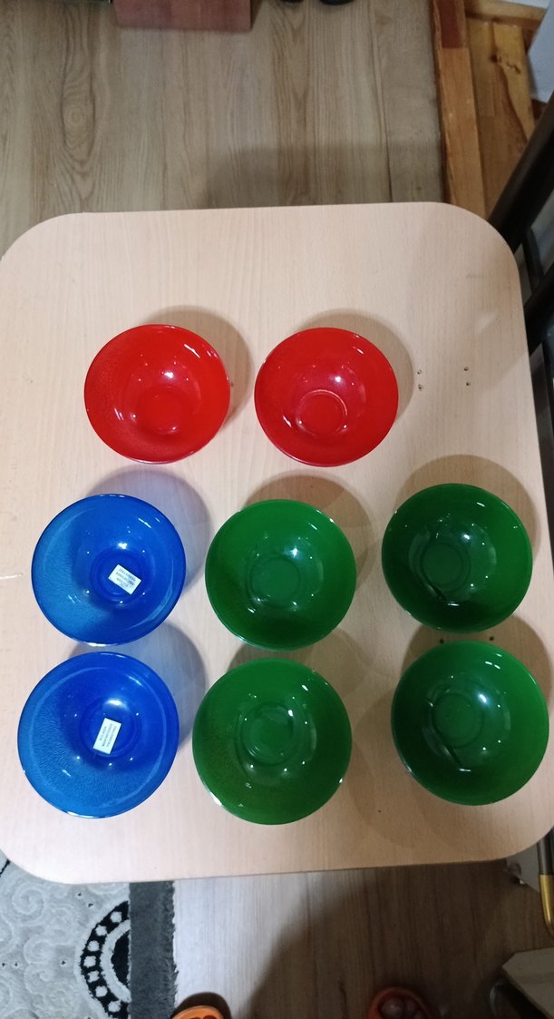 bulaşık makinesinde yıkamayınız Kırmızı, mavi ve yeşil renklerde, desen içermeyen cam kaseler seti. Servis veya dekorasyon için uygundur. ️