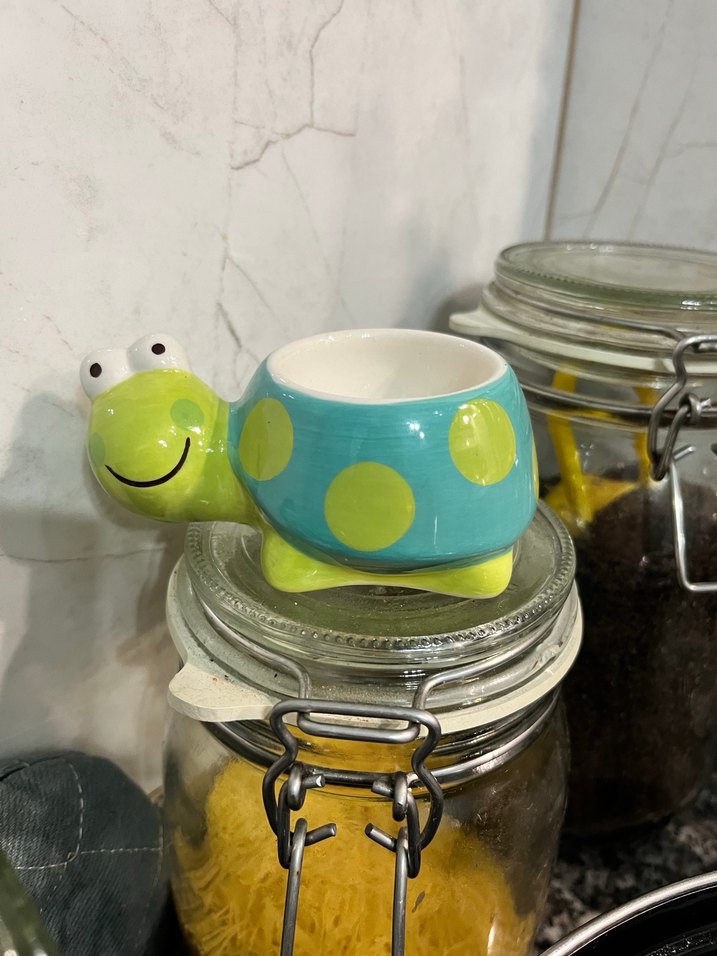 Paşabahçe Renkli kaplumbağa şeklinde seramik kase, turkuaz kabuğunda sarı noktalar ve gülen yüzüyle mutfağınıza eğlenceli bir dokunuş katıyor.