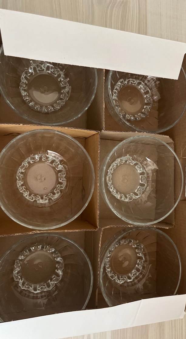 Altı adet şeffaf cam kase seti, tabanları dekoratif ve açık bej tonunda. Çeşitli yemekler için uygun sade ve şık tasarım.