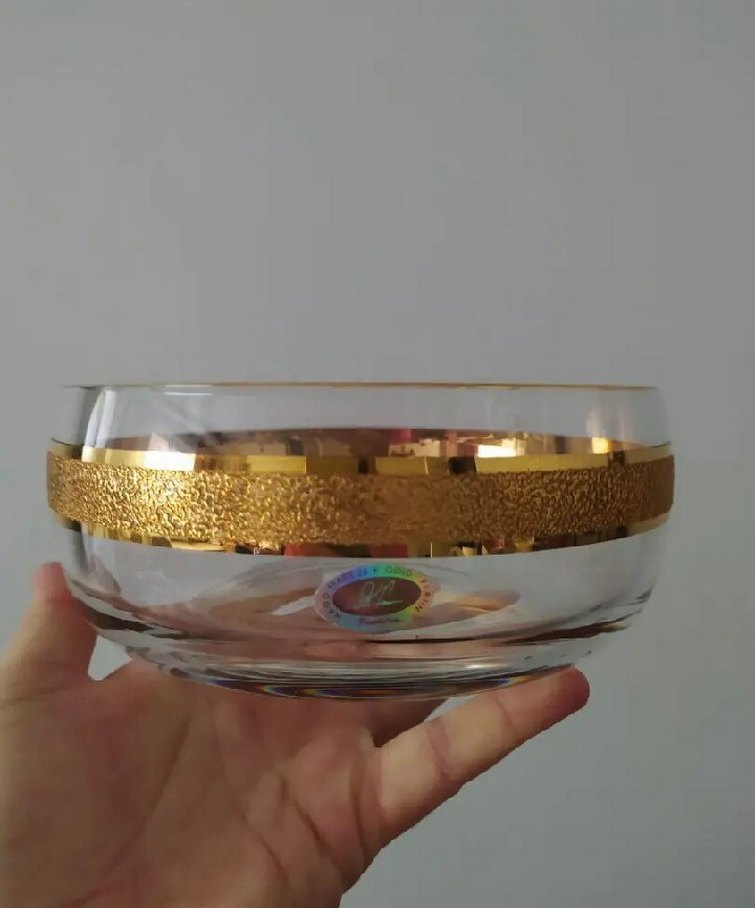 Şeffaf cam kase, kenarında parlak ve dokulu altın şerit bulunur. Sunum veya dekor için uygundur. ✨