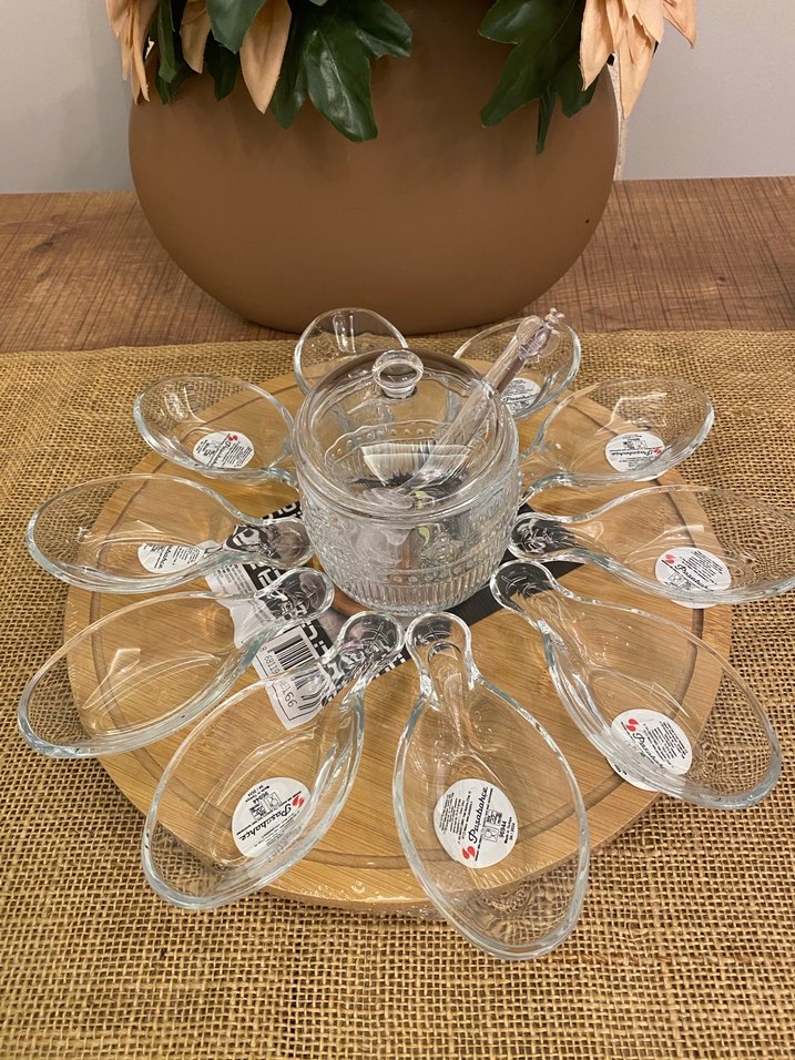 Paşabahçe marka 10 adet mini cam sunumluk,ister kahvaltılık,ister sosluk,isterseniz kahve yanı lokumluk vs olarak tercih edebilirsiniz,bal kasesi ve bal kaşığı madame Coco’dur,alt ahşap 360 derece dönerlidir,tamamı yeni ve sıfırdır