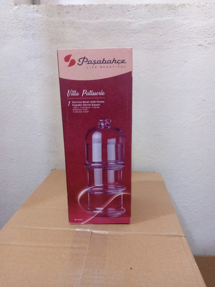 Bej renkte Paşabahçe Villa Patisserie cam servis kabı, kapaklı tasarım ile sunum için uygundur. ️üçlü servis kasesi.sıfır hiç kullanılmadı.