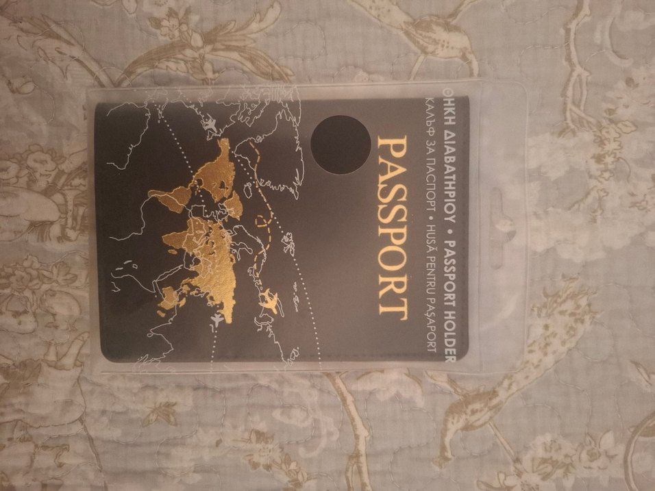 Pasaportunuzu korumak için tasarlanmış, dünya haritası ve altın detaylı pasaport kılıfı. Çok dilli yazılar içerir. ✈️