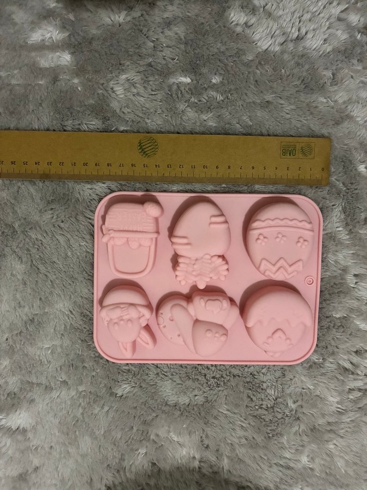 Pembe pastel renkli silikon kek kalıbı, Paskalya temalı yumurta, tavşan ve sepet şekilleri içerir. Festivaller için uygundur.