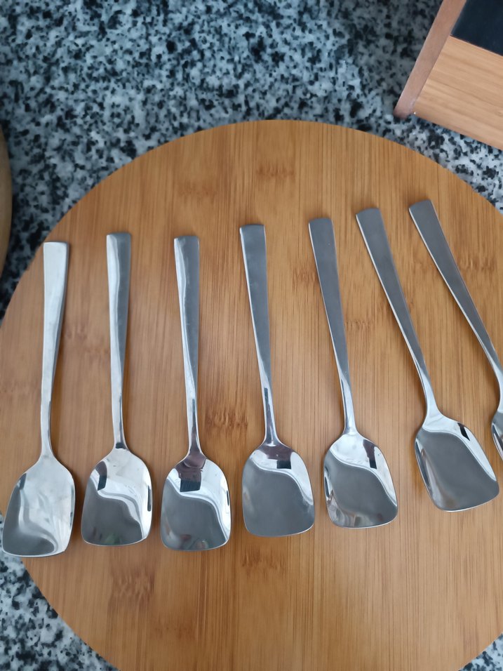 Modern tasarımlı, parlak paslanmaz çelikten 7 parça tatlı kaşığı seti. Bej renkli ahşap yüzey üzerinde sergilenmektedir. sıfır ürünler nehir markasina ait