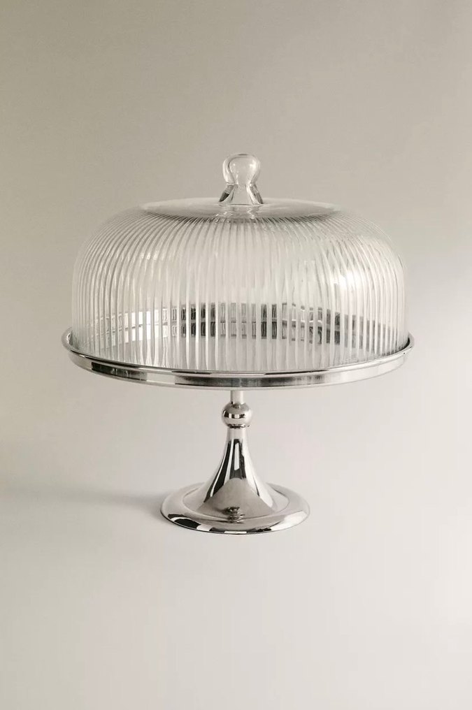 Parlak beyaz çizgili cam kapak ve parlak metal tabanlı modern klasik pasta standı, şıklığı ve işlevselliği bir araya getirir.