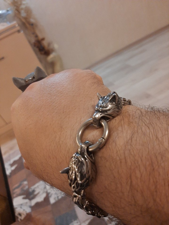 Paslanmaz çelik Çift Kurt başlı bileklik; 316L kalite paslanmaz çelik olup Denizde havuzda duşta bileginizden çıkarmadan kullanabilirsiniz Bileklik uzunluğu 25 cm dır