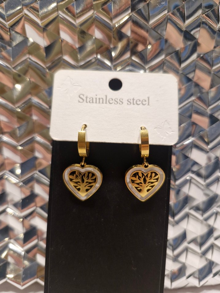 Paslanmaz çelikten üretilmiş, hayat ağacı figürlü kalp tasarıma sahip şık küpe satılıktır. Altın renk kaplamalı, sallantılı modeldir. Günlük kullanım ve hediye için uygundur, kararma yapmaz. Ürün sıfıra yakındır ve kartıyla birlikte gönderilecektir. Fotoğraflar ürüne aittir.