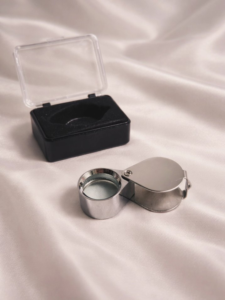 Parlak altın renkli katlanabilir büyüteç, koruyucu siyah kutu ile birlikte gelir. Kompakt ve taşınabilir yapıda, yakından inceleme için uygun. Paslanmaz çelik ve cam mercekli