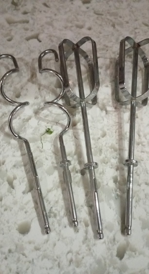 Mutfakta çeşitli karıştırma işlemleri için uygun paslanmaz çelikten yapılmış hamur kancaları ve çırpıcılar seti.