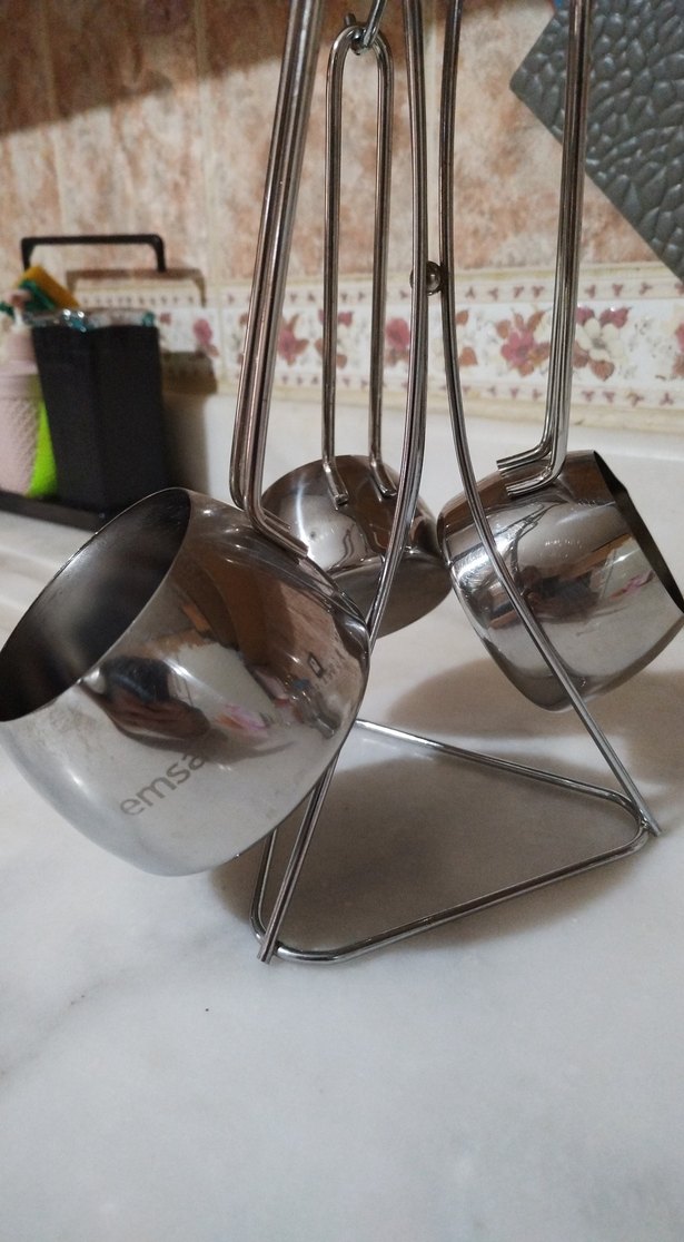 Paslanmaz çelikten yapılmış, standlı ölçü cezve seti. Mutfakta kullanıma uygun gri tonlarında. Sadece küçük olanın içinde hafif bir yanık var görsellerde olduğu gibidir. #cezve #ucuz #emsan #mutfak #mutfakaletleri #gri #azkullanılmış
