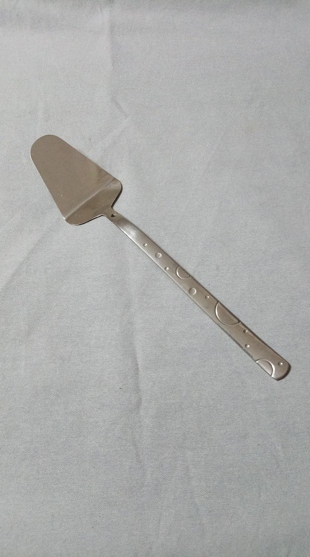 Paslanmaz Çelik Pasta Spatulası Paslanmaz çelikten yapılmış, gri renkli sapı ve dekoratif noktaları olan, bej tonlu spatula başlığı ile pastaları düzgünce servis etmek için uygundur.