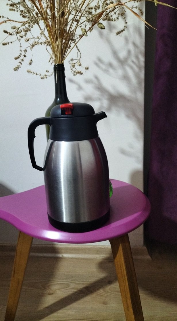 Paslanmaz çelik gövdeli, siyah sap ve kapaklı renkli termos Üstte kolay döküm için kırmızı buton bulunur.