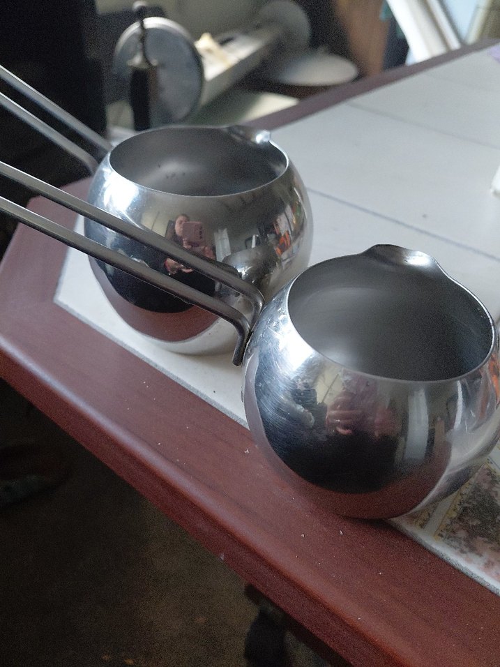 İki adet saplı paslanmaz çelik sütlük cezve seti, süt veya sosları ısıtmak ve servis yapmak için uygundur.