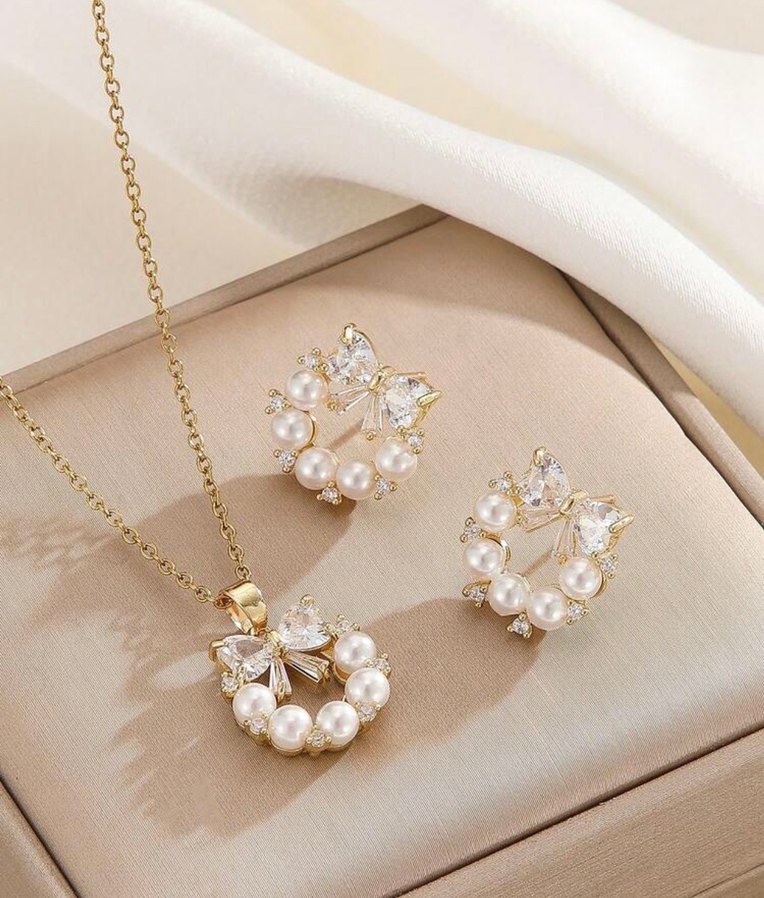 inci ve kristal işlemeli altın renkli boncuklu kolye ve küpe seti, düğünler için uygun.
