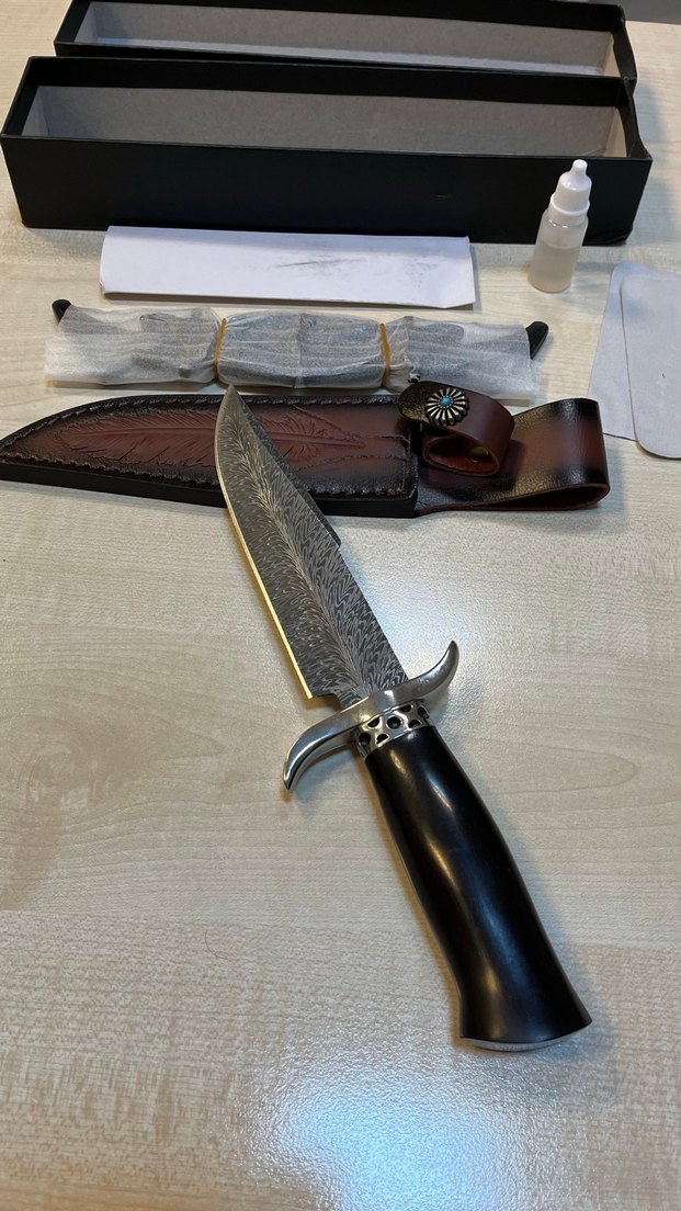 Paslanmaz damascus çelik abonoz ağacı kabze standlı bakım yağı temizlik bezi kutulu poşetli tam set tam bir koleksiyon ürünü üst düzey sanmai paslanmaz damascus