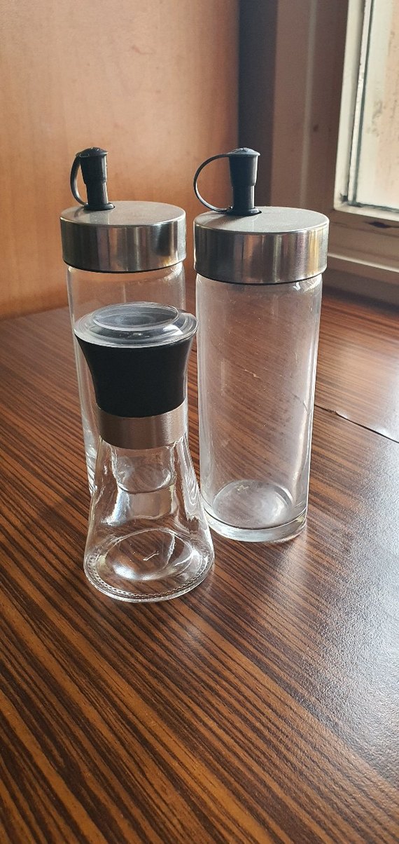 Paslanmaz kapaklı, biri gri silikon tutacaklı iki cam baharatlık seti. Baharat veya soslar için kullanışlıdır.