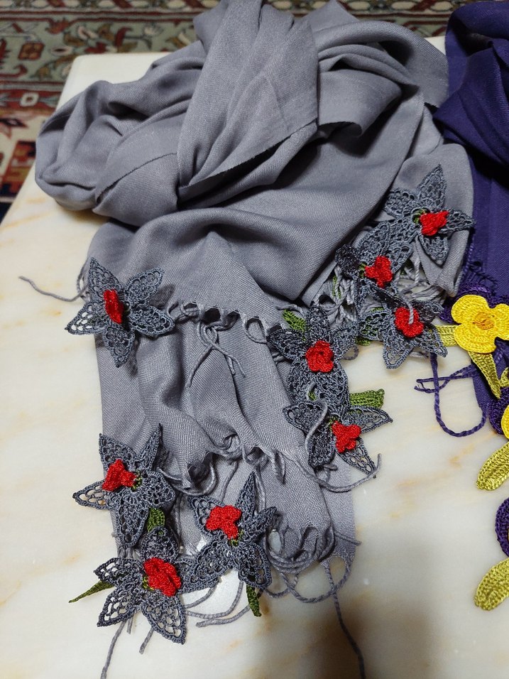 Gri kumaştan yapılmış, kırmızı çiçek detaylı dantel süslemeli bohem tarzda kadın şal. Kombinlere farklı bir hava katar. Adet fiyati 450 tl