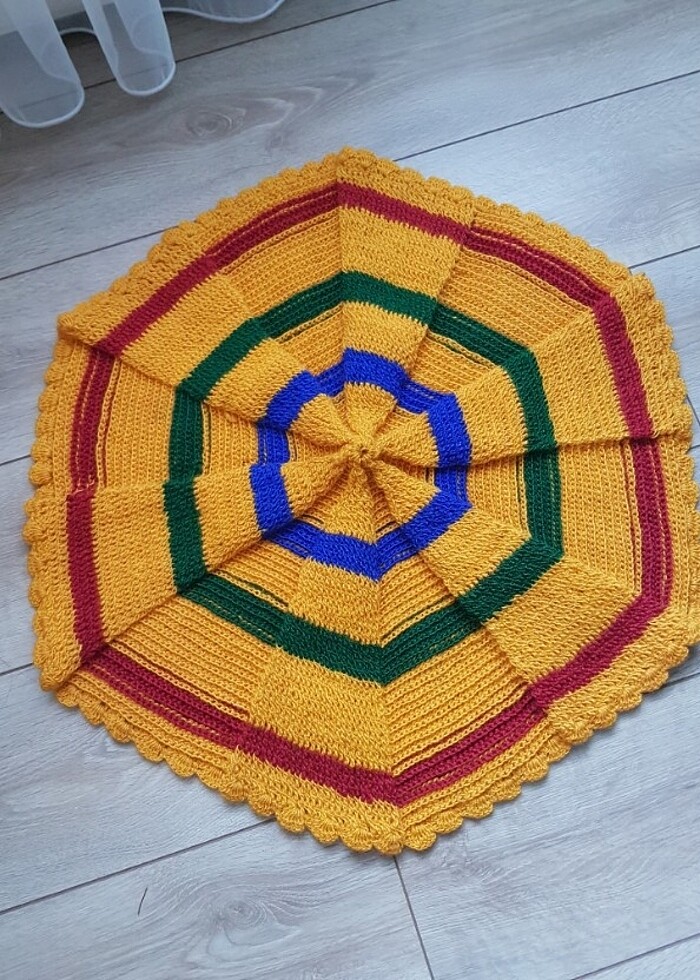 El örgüsü,kusursuz,hiç kullanılmadı,utulenirse çok şık duracak bir paspas.capi 64 cm dır.modeli çok emek isteyen bir modeldir.