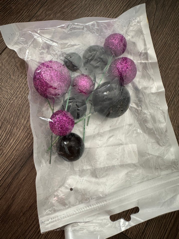 Parlak mor ve koyu renk toplar.pasta süsü olarak iki paket almıştım bunu açtık ama hiç kullanmadık