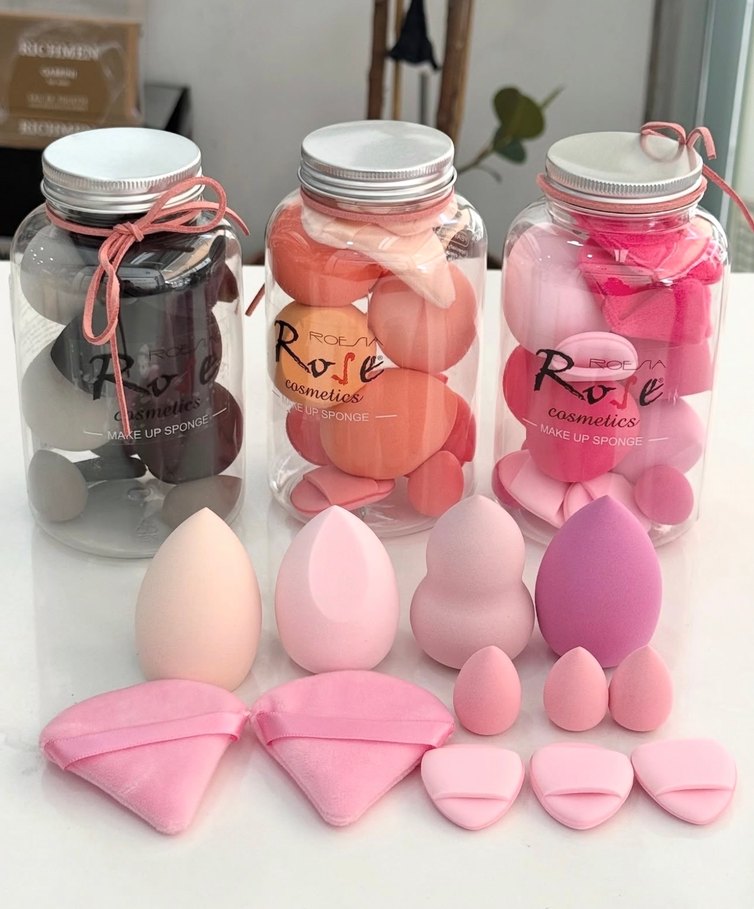 Pastel renkte, farklı şekillerde makyaj süngerleri içeren set. Şeffaf kavanozlarda, gümüş kapaklı paketlenmiştir.
