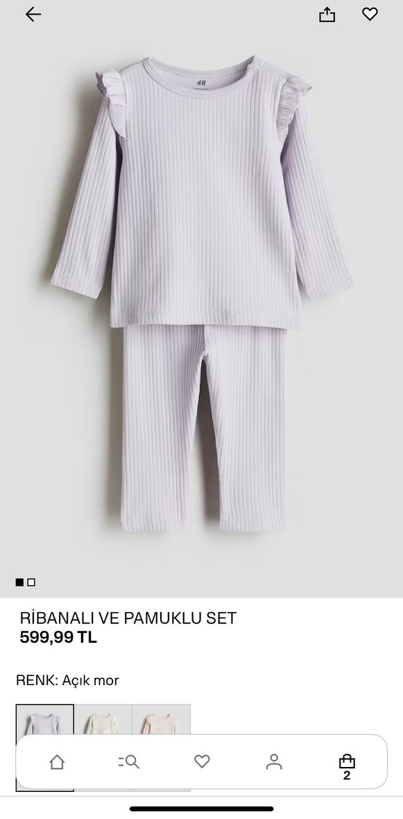 Pastel açık mor renkte, uzun kollu ve pamuklu plise kumaştan oluşan bebek kız takımıdır. Rahat üst ve pantolondan oluşur.
