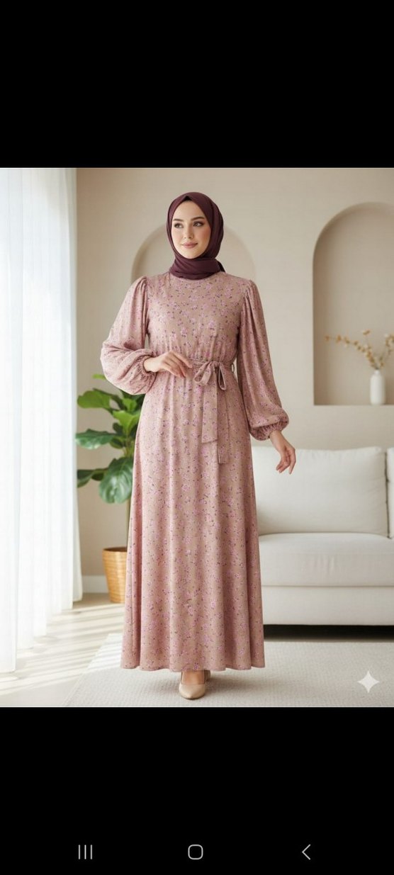 Uzun, salaş kesimli bu elbise, uzun kollu ve yuvarlak yakalıdır. Pastel tonlarda batik desenli, belden bağcıklıdır ve yumuşak sentetik kumaştan üretilmiştir. etiketi mevcut kuşağı var kullanılmadı