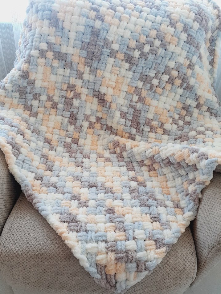 Pastel bej tonlarında, bağlamalı desenli yumuşak örgü çocuk battaniyesi. Sıcak ve rahat bir kullanım sunar.