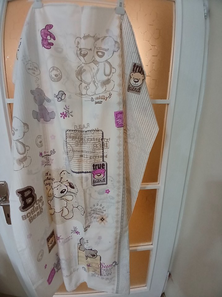 Bej renkli çocuk battaniyesi, yumuşak sentetik kumaş üzerine pastel baskılı desenlere sahiptir, rahatlık ve sıcaklık sağlar.
