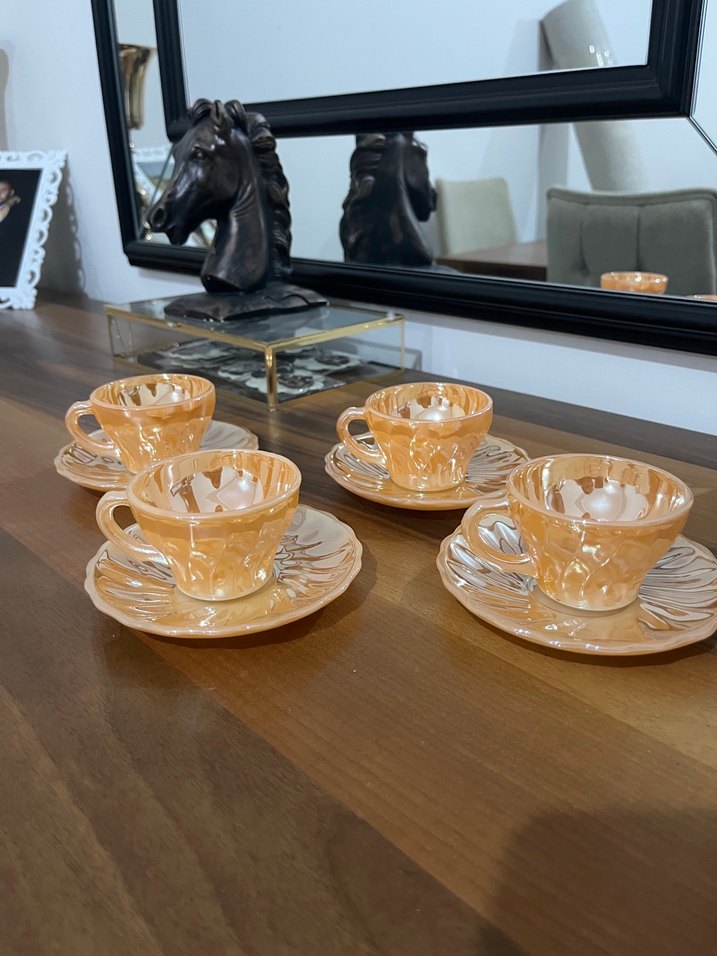Pastel bej renkte, şeffaf ve zarif tasarıma sahip 4 adet kahve fincanı ve tabak seti. Kahve sunumlarınız için idealdir. ☕
