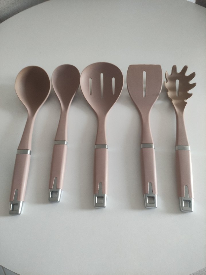 Metal detaylı ve askı halkalı, çeşitli yemekler için kullanılabilen pastel bej renkli 5 parça mutfak kepçesi seti.