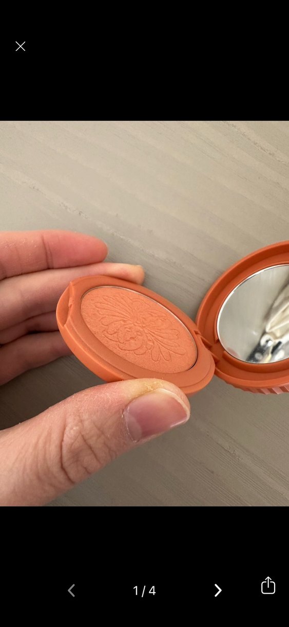 Pastel bej tonlarında, çiçek desenli kabartmalı allık, aynalı kompakt kutuda sunulmuştur.