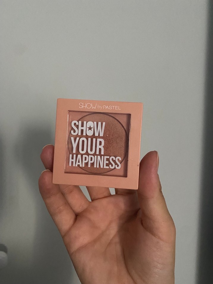 Pastel bej tonlarında, doğal bitişli allık. Üzerinde 'Show Your Happiness' yazan kompakt tasarım.