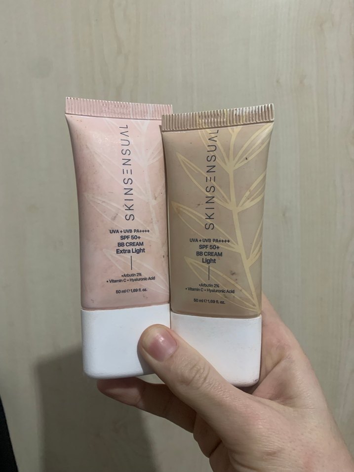 Pastel bej tonlarında iki BB krem seti. SPF 50+ koruma sağlar, C vitamini ve hyaluronik asit içerir, hafif ve doğal bir görünüm sunar.