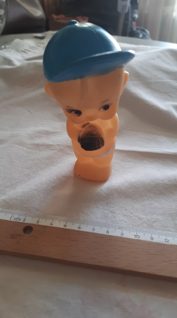 Mavi şapkalı figür şeklinde, yaklaşık 10 cm boyunda pastel bej renkte bebek biberonu.