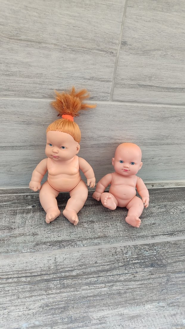 Detaylı yüz ifadelerine sahip, pastel bej renkte iki oyuncak bebek. Biri toplu saçlı, diğeri kel.