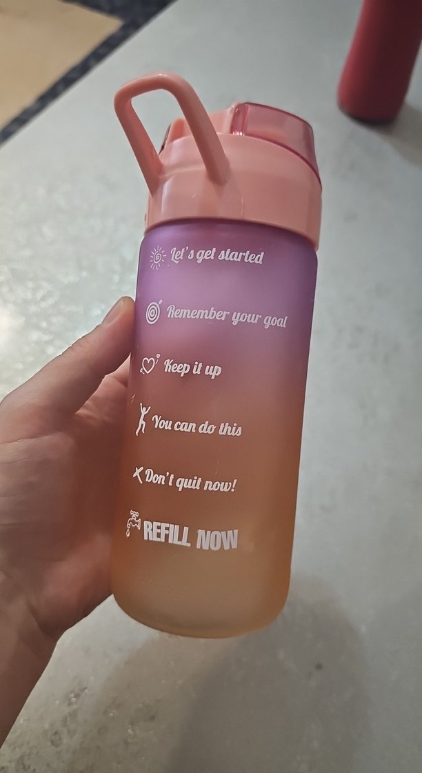 Pastel bej renkte, üzerinde motive edici yazılar bulunan, saplı ve kapaklı bebek suluk.