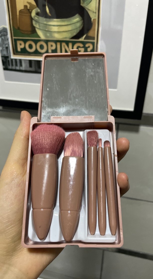 Pastel bej saplı ve yumuşak kıllı beş makyaj fırçası seti, aynalı kompakt kutuda saklanır. Mini çanta boy