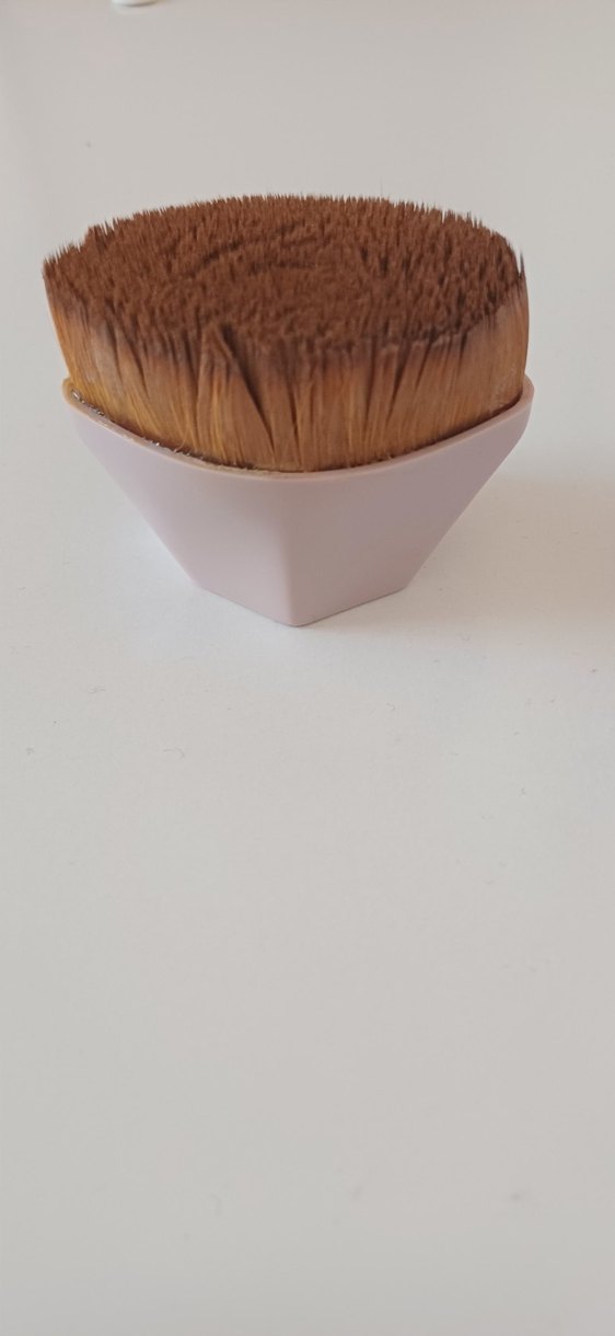 Yumuşak kıllara ve pastel bej renkte kulpa sahip makyaj fırçası.