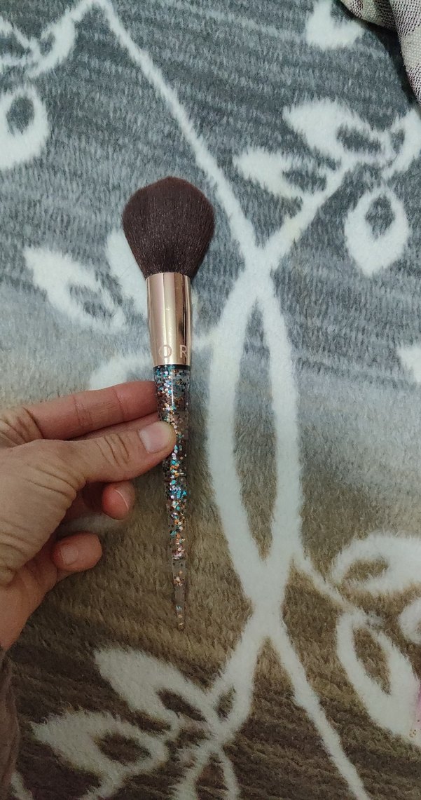 Pastel, simli saplı ve yumuşak kıllara sahip bej makyaj fırçası. ✨