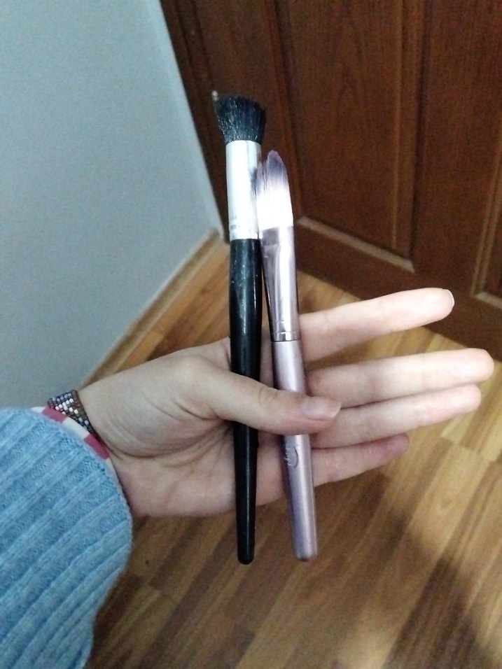 İki adet pastel renkli, yumuşak kıllı makyaj fırçası seti. Bej ve siyah saplı, çeşitli makyaj ürünleri için uygundur. ️